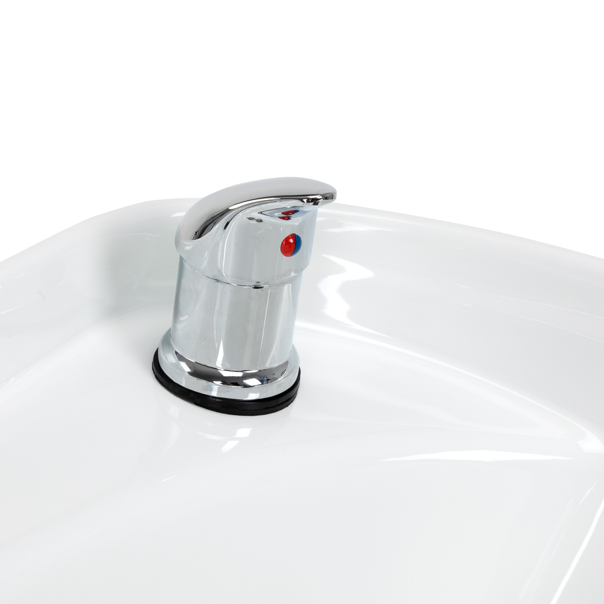 Gustowna umywalka dla wygody użytkowaniaGłębokość ceramicznej misy umywalki w odcieniach bieli pozwala na komfortowe i efektywne wykonywanie szerokiej gamy usług fryzjerskich, zapobiegając nadmiernemu rozchlapywaniu wody oraz używanych w trakcie zabiegu produktów. Zastosowany materiał sprawia, że umywalka jest wytrzymała, odporna na przebarwienia i zadrapania oraz bardzo łatwa do utrzymania w czystości. Odpowiednio wyprofilowany kołnierz oraz nachylone oparcie zapewniają wsparcie i wygodę w trakcie mycia włosów, a dzięki komfortowej nakładce z tworzywa sztucznego w odcieniach czerni klient nie odczuje nieprzyjemności związanych z chłodem ceramicznej powierzchni.