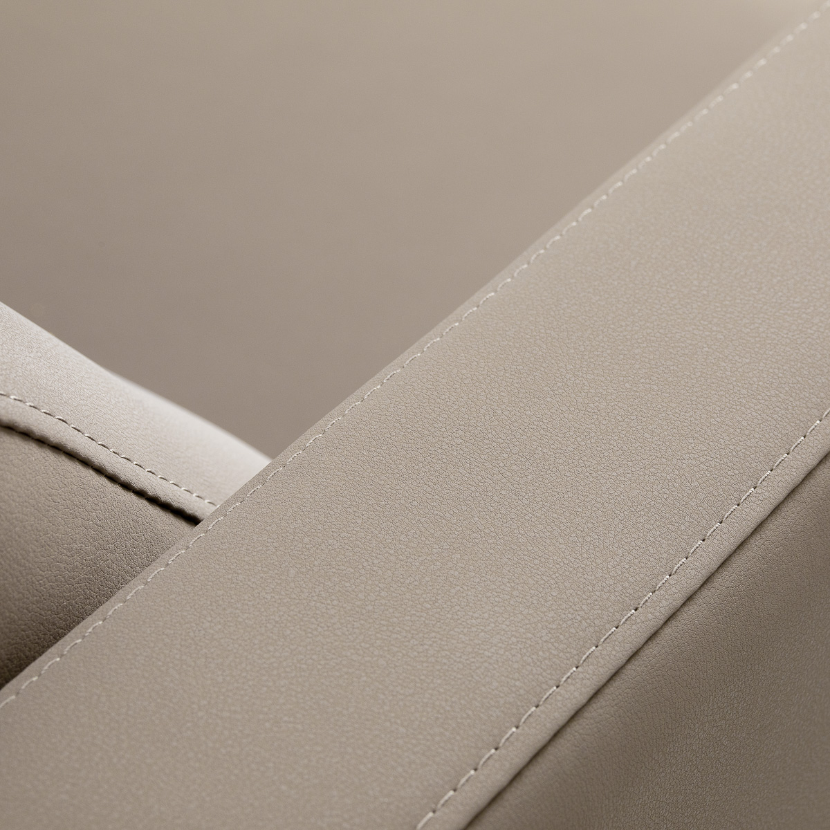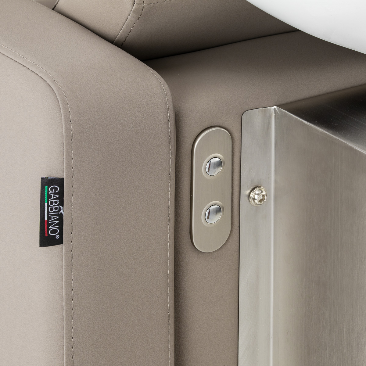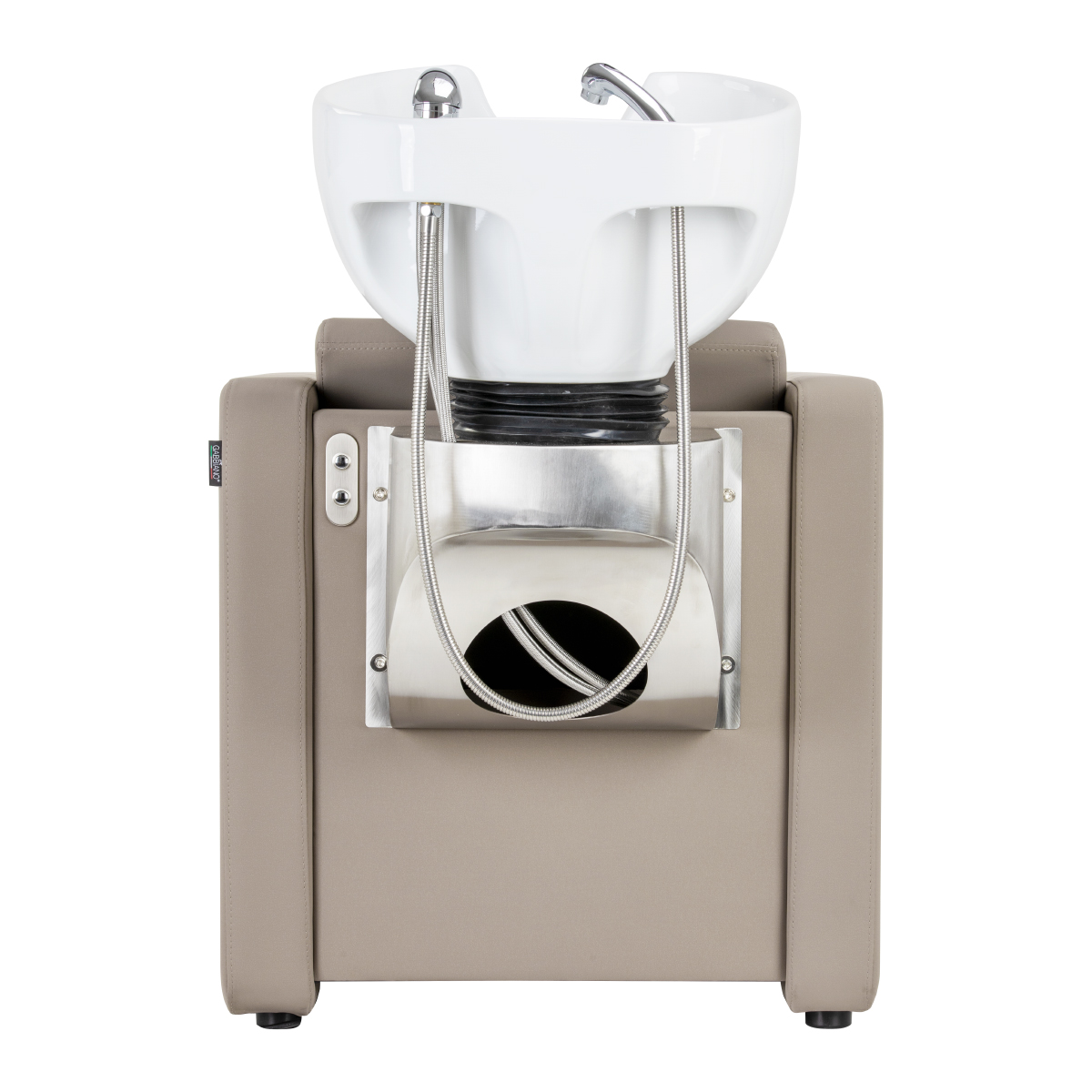 Nowoczesny wygląd przy wysokiej funkcjonalnościMyjnia fryzjerska Gabbiano Sylvia została zaprojektowana z myślą o komfortowym wykonywaniu zabiegów pielęgnacyjnych czy koloryzacji oraz zapewnieniu klientowi wygodnej pozycji podczas dłuższych procedur. Przyciąga wzrok prostotą i geometryczną formą, a prostopadłe linie siedziska oraz podłokietników nadają jej nowoczesnego charakteru. Oparcie umieszczone pod optymalnym kątem sprzyja doskonałemu wsparciu kręgosłupa. Odpowiednio wyprofilowane siedzisko wypełnione trwałą pianką zapewnia wysoki komfort użytkowania, a tapicerowane podłokietniki pozwalają na prawidłowe ułożenie barków klienta. Pokrycie ze skóry syntetycznej w odcieniach beżu gwarantuje wieloletnią wytrzymałość oraz łatwość czyszczenia. Elegancki, minimalistyczny wygląd myjni nadaje wnętrzom niepowtarzalnego wyrazu. W zestawie znajduje się kompletna armatura w odcieniach chromu, w tym bateria, słuchawka prysznicowa oraz dedykowane węże, aby zapewnić całkowity zestaw narzędzi do pracy.