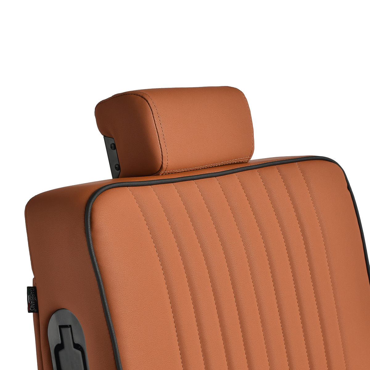Czarna, okrągła podstawa zapewnia stabilność oraz trwałość użytkowania. Obicie z miękkiej, matowej skóry syntetycznej łączy komfort z wytrzymałością. Zastosowane materiały są odporne na wilgoć, trwałe i łatwe w czyszczeniu. Stylowe przeszycia i tapicerka w odcieniach brązu nadają mu wyjątkowego charakteru, idealnie komponującego się z wystrojem nowoczesnych salonów barberskich. Połączenie eleganckiego odcienia obicia z czarną ramą i podstawą podkreśla nowoczesny, profesjonalny wygląd fotela.