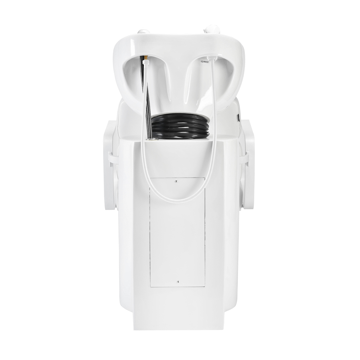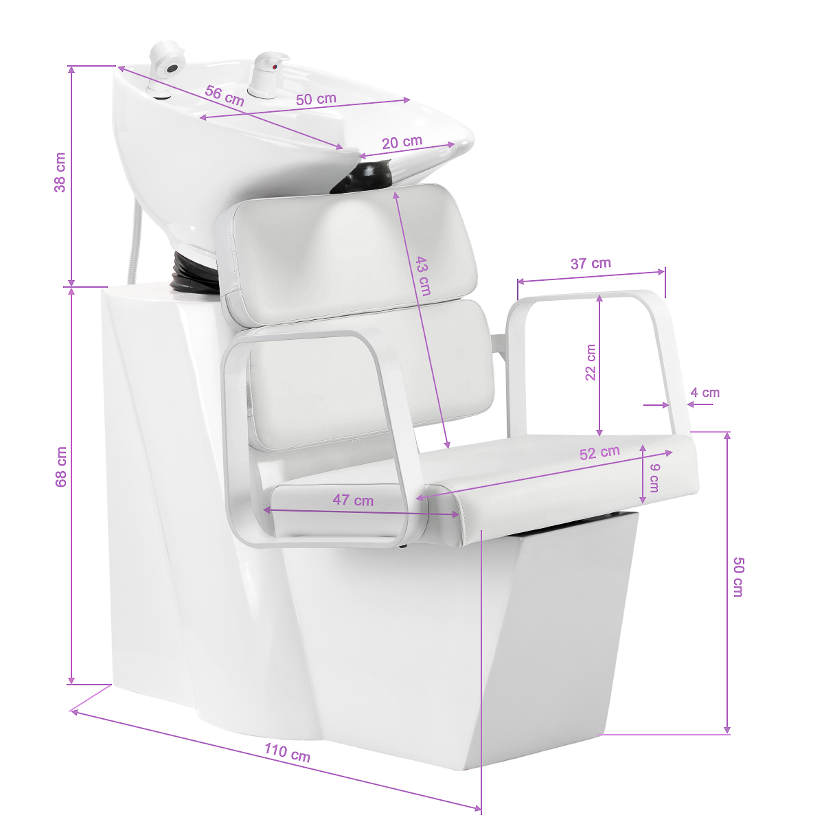 Funkcjonalny mebel o nowoczesnym designieWyprofilowany fotel zapewnia odpowiednie wsparcie lędźwi, a co za tym idzie wysoki komfort użytkowania. Metalowe podłokietniki w odcieniach bieli o geometrycznym kształcie pozwalają na prawidłowe ułożenie barków klienta. Wypełnienie z trwałej, odpornej na odkształcenia pianki oraz obicie wykonane z przyjemnej w dotyku skóry syntetycznej w odcieniach bieli zapewniają trwałość mebla, łatwość czyszczenia i komfortowe użytkowanie przez długi czas. Oryginalny, elegancki wygląd myjni nadaje wnętrzom niepowtarzalnego wyrazu. W zestawie znajduje się kompletna armatura w odcieniach bieli, w tym bateria, słuchawka prysznicowa oraz dedykowane węże, aby zapewnić kompletny zestaw narzędzi do pracy.