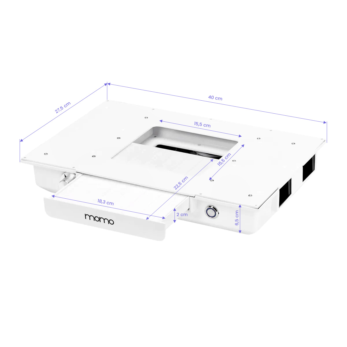 Wbudowany pochłaniacz pyłu kasetowyKasetowy pochłaniacz pyłu Momo J-02 wbudowany w blat znacząco poprawia komfort i higienę pracy, skutecznie usuwając pył powstały podczas zabiegów kosmetycznych, takich jak manicure. Dzięki temu urządzeniu powietrze w salonie pozostaje czyste, a miejsce pracy wolne od zanieczyszczeń, co zwiększa bezpieczeństwo zarówno dla kosmetyczki, jak i klientów. Pochłaniacz pyłu jest łatwy w obsłudze i konserwacji, co dodatkowo podnosi jego funkcjonalność. Regularne czyszczenie oraz wymiana filtra zapewniają niezmiennie wysoką skuteczność pochłaniania. Istnieje możliwość zakupu dodatkowych filtrów wymiennych (SKU 123581). W naszym sklepie dostępny jest również filtr z aktywnym węglem (SKU 123582), który skutecznie eliminuje alergeny i drobnoustroje, podnosząc poziom higieny w salonie.