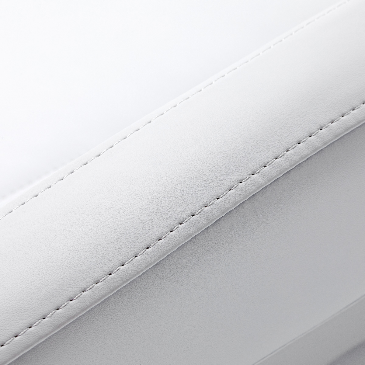 Solidna konstrukcja fotela zapewnia stabilność i wytrzymałość w codziennym użytkowaniu. Siedzisko wypełnione pianką o odpowiednio dobranej twardości gwarantuje komfort nawet podczas długotrwałych zabiegów. Obicie z wysokiej jakości, przyjemnej w dotyku imitacji skóry w odcieniach bieli nadaje całości profesjonalny wygląd, a jednocześnie jest odporne na wilgoć i łatwe w utrzymaniu czystości. Trwała podstawa gwarantuje stabilność, a precyzyjne wykończenia podkreślają nowoczesny charakter fotela i zwiększają ergonomię siedziska.