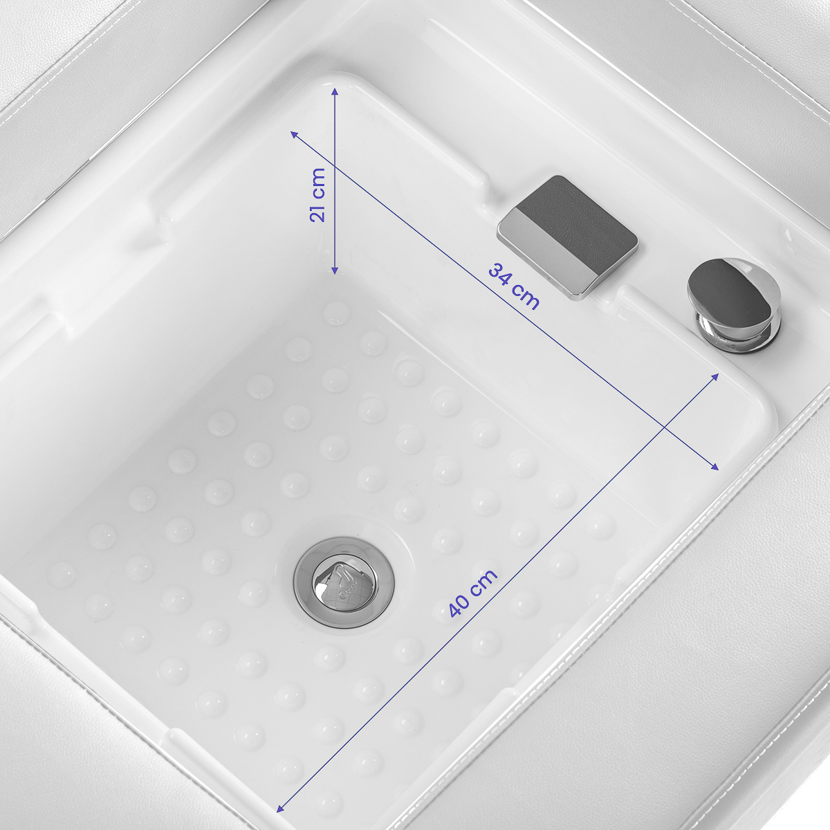 Komfortowe użytkowanieGłęboka ceramiczna misa w odcieniach bieli skutecznie ogranicza rozchlapywanie wody oraz preparatów stosowanych podczas zabiegów, zapewniając czystość i wygodę pracy. Wykonana z trwałego materiału misa jest odporna na przebarwienia, zarysowania i uszkodzenia, a jej gładka powierzchnia sprawia, że utrzymanie czystości jest wyjątkowo łatwe. Jej charakterystyczne wyprofilowanie nie tylko ułatwia dostęp osobie wykonującej usługę, ale także nadaje myjni elegancki i nowoczesny wygląd. Połączenie estetyki z funkcjonalnością podnosi standard każdej profesjonalnej przestrzeni.