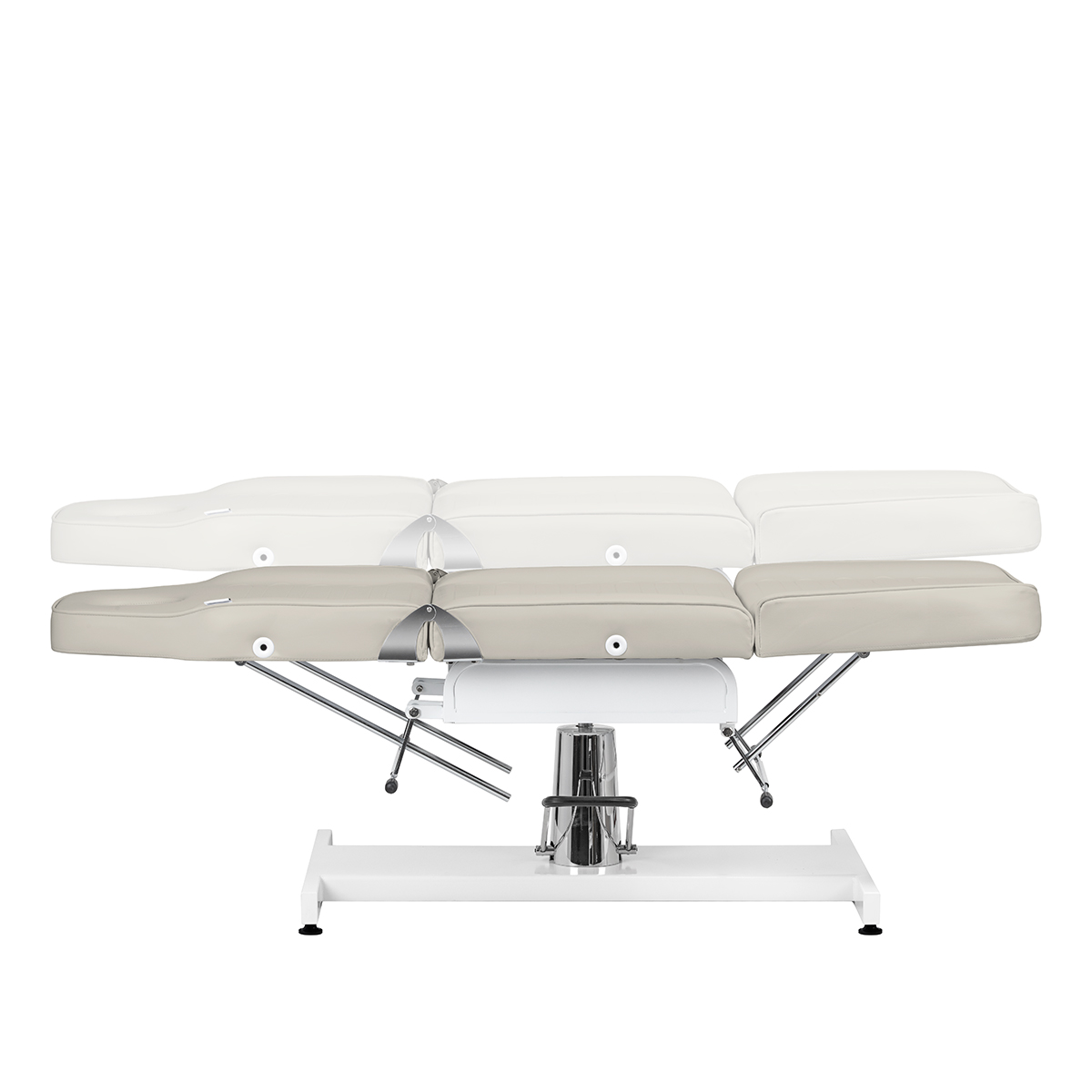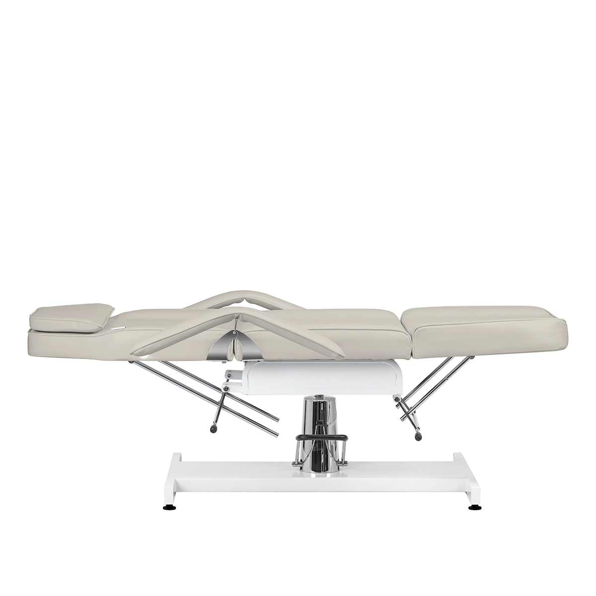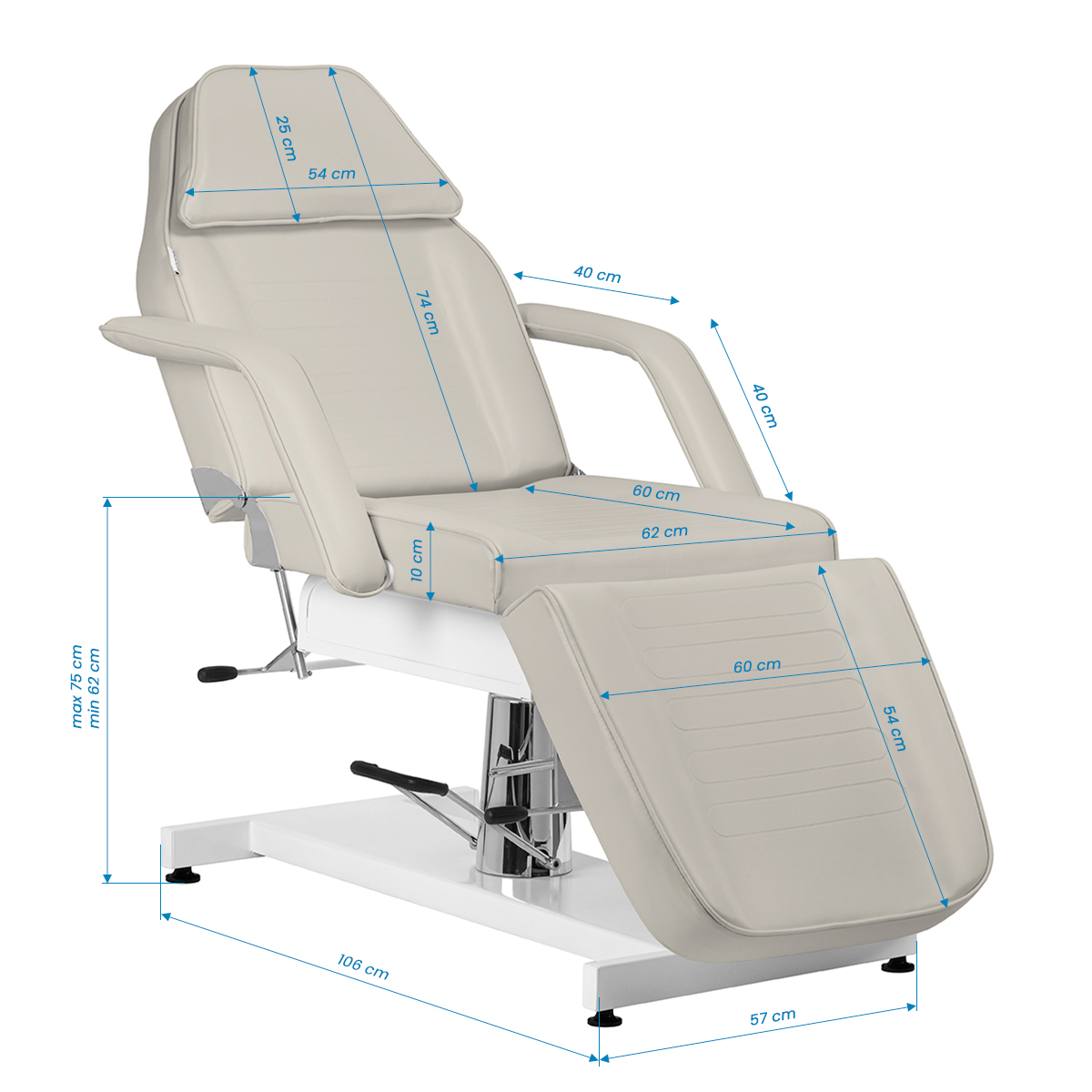 Przy pomocy specjalnych dźwigni możliwa jest bezstopniowa regulacja kątów, pod którymi znajdują się podnóżek i oparcie. Pozwala to na optymalne dostosowanie ustawień do indywidualnych potrzeb, dla prawidłowego i wygodnego wykonywania zabiegów oraz komfortu użytkowania. Fotel można rozłożyć aż do pozycji leżanki, co znacząco zwiększa jego funkcjonalność zarówno podczas zabiegów na twarz, jak i ciało.
