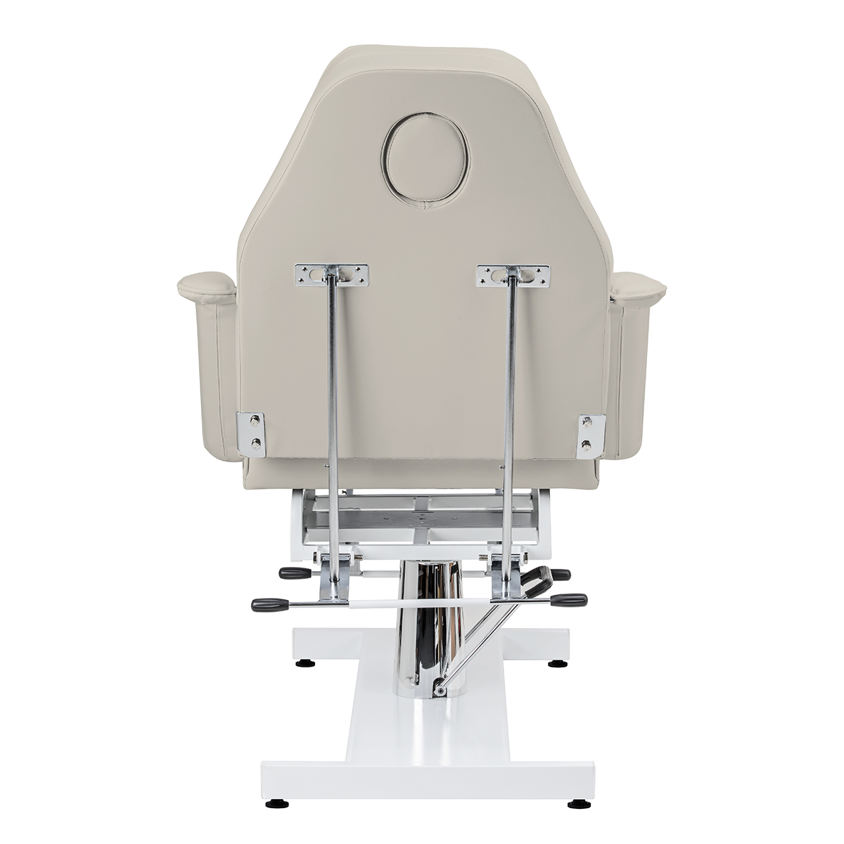 Wysokość fotela można dostosowywać w zakresie 62-75 cm bez użycia rąk za pomocą pompy hydraulicznej. Pozwala to na komfortowe korzystanie ze sprzętu osobom o różnym wzroście i umożliwia dostosowanie go do indywidualnych potrzeb zarówno klienta, jak i osoby wykonującej zabieg. Zastosowany mechanizm jest bardzo trwały i niezawodny. Dzięki otworowi w zagłówku, który jest ukryty pod odpowiednio wyprofilowaną poduszką, fotel doskonale sprawdzi się również przy zabiegach przeprowadzanych na plecach, takich jak masaże.