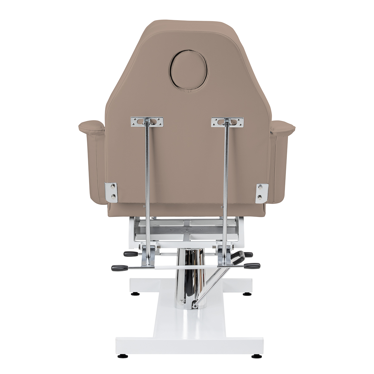 Wysokość fotela można dostosowywać w zakresie 62-75 cm bez użycia rąk za pomocą pompy hydraulicznej. Pozwala to na komfortowe korzystanie ze sprzętu osobom o różnym wzroście i umożliwia dostosowanie go do indywidualnych potrzeb zarówno klienta, jak i osoby wykonującej zabieg. Zastosowany mechanizm jest bardzo trwały i niezawodny. Dzięki otworowi w zagłówku, który jest ukryty pod odpowiednio wyprofilowaną poduszką, fotel doskonale sprawdzi się również przy zabiegach przeprowadzanych na plecach, takich jak masaże.