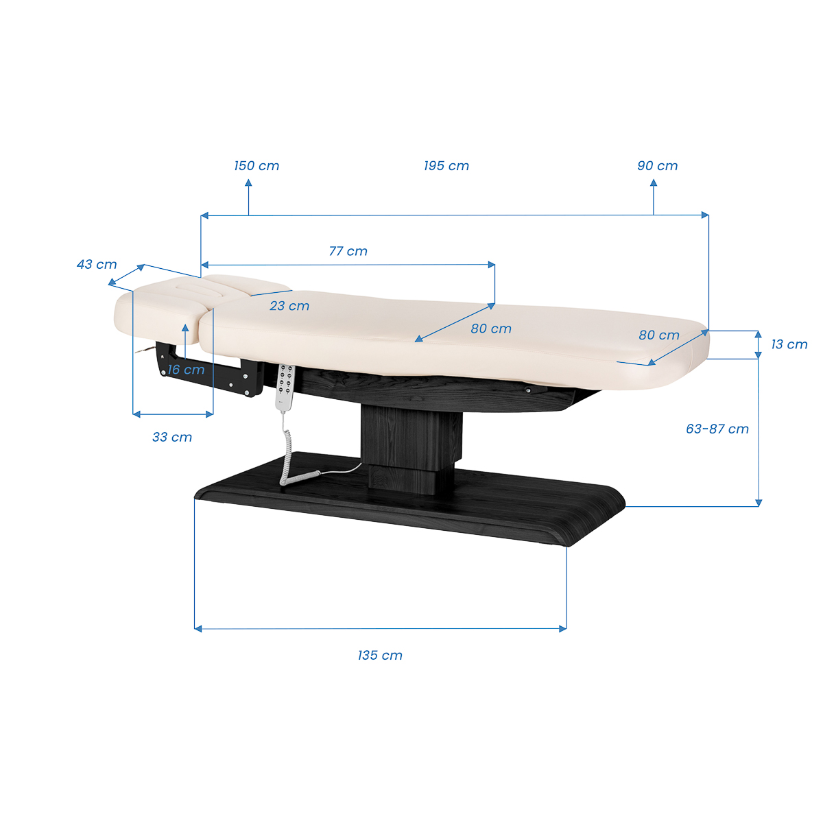 Elektryczna regulacja dla pełnej kontroli ustawieńLeżanka wyposażona jest w elektryczną regulację wysokości w zakresie 63-87 cm oraz kąta nachylenia oparcia i części podnóżkowej, co pozwala precyzyjnie dopasować pozycję do rodzaju wykonywanego zabiegu. Szeroki zakres regulacji ułatwia przyjęcie ergonomicznej pozycji pracy, niezależnie od wzrostu specjalisty czy specyfiki procedury. Sterowanie odbywa się za pomocą praktycznego pilota, którego czytelnie oznaczone przyciski umożliwiają intuicyjną obsługę wszystkich funkcji, co przekłada się na wygodę obsługi i płynność pracy w gabinecie. Jednoczesna regulacja oparcia i podnóżka jednym przyciskiem pozwala błyskawicznie ustawić pozycję siedzącą, półleżącą lub leżącą – bez przerywania zabiegu. Płynna zmiana ustawień wspiera ergonomię pracy i podnosi komfort klienta na każdym etapie procedury.
