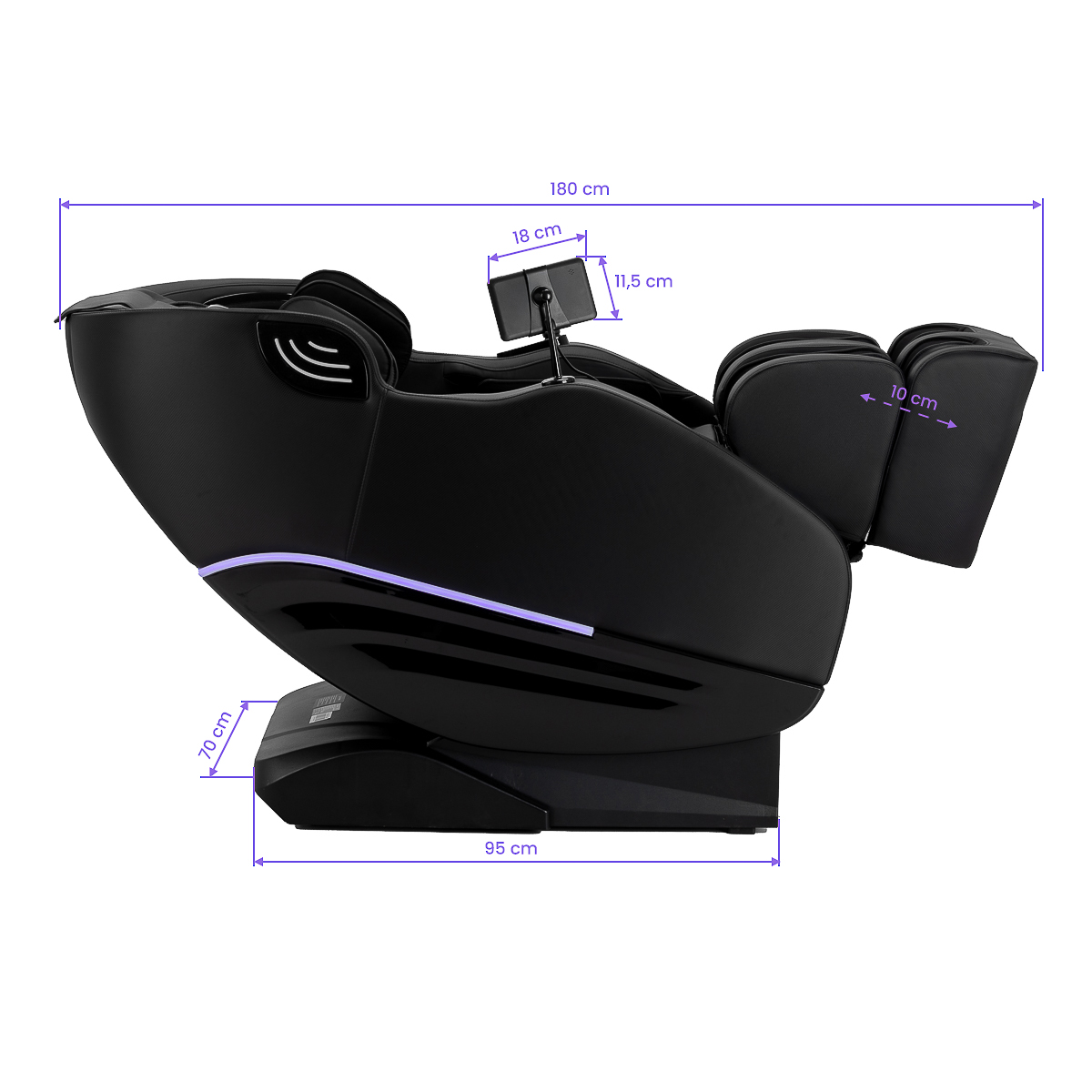 Dodatkowe funkcje dla jeszcze większego komfortuFotel wyposażono w system podgrzewania pleców i łydek, który wspomaga rozluźnianie napiętych mięśni, zwiększając przyjemność i skuteczność masażu. Mechaniczna regulacja wysunięcia podnóżka pozwala idealnie dopasować fotel do wzrostu użytkownika, zapewniając wygodną i ergonomiczną pozycję podczas każdej sesji. Dodatkowo model został wzbogacony o podświetlane elementy boczne, które nadają mu nowoczesny i elegancki charakter, tworząc przyjemną, relaksującą atmosferę i pełniąc funkcję elementu dekoracyjnego, który wzbogaca wystrój wnętrza.