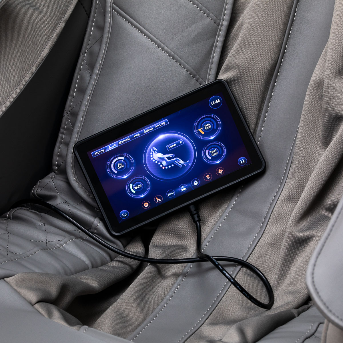 Panel sterowania z czytelnym ekranemPanel sterowania umożliwia łatwe dostosowanie masażu do indywidualnych potrzeb. Dla większej wygody można umieścić go w uchwycie na prawym podłokietniku lub trzymać w dłoniach. Na ekranie wyraźnie prezentowane są wszystkie kluczowe informacje – aktualnie masowane partie ciała, intensywność masażu, czas trwania sesji oraz wybrany program. Panel pozwala przełączać się między trybami automatycznymi i manualnymi oraz włączać sterowanie głosem, zwiększając komfort obsługi. Za jego pomocą można wygodnie wybierać spośród dostępnych trybów masażu, regulować intensywność, dopasować ustawienia fotela i precyzyjnie dostosowywać czas sesji w odstępach co 5 minut (5, 10, 15, 20, 25 lub 30 minut), zapewniając idealną długość masażu dopasowaną do potrzeb użytkownika.