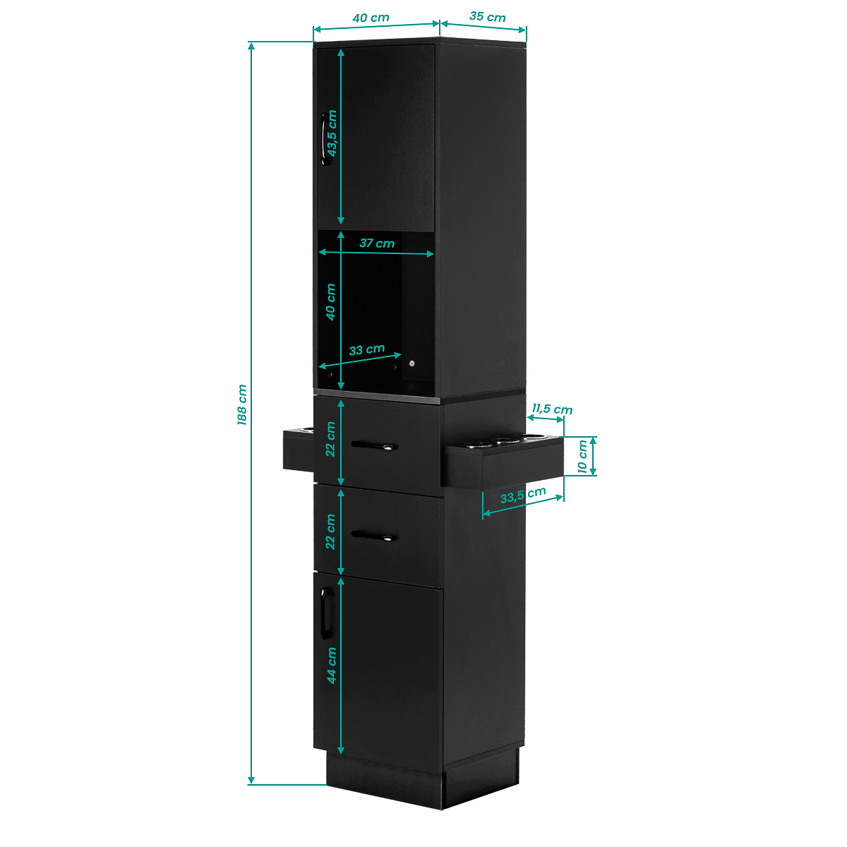 Połączenie designu i funkcjonalnościSolidna konstrukcja zapewnia stabilność, a gładkie powierzchnie ułatwiają utrzymanie mebla w czystości. Klasyczna kolorystyka nadaje szafce ponadczasowy charakter, który świetnie dopasuje się zarówno do minimalistycznych, jak i bardziej wyrazistych aranżacji. Czarne uchwyty nie tylko podkreślają elegancki design, ale także zapewniają wygodne otwieranie każdej z szafek i szuflad. Całość stanowi praktyczne rozwiązanie do salonu fryzjerskiego, w którym istotne są porządek, ergonomia pracy oraz spójna estetyka stanowiska.