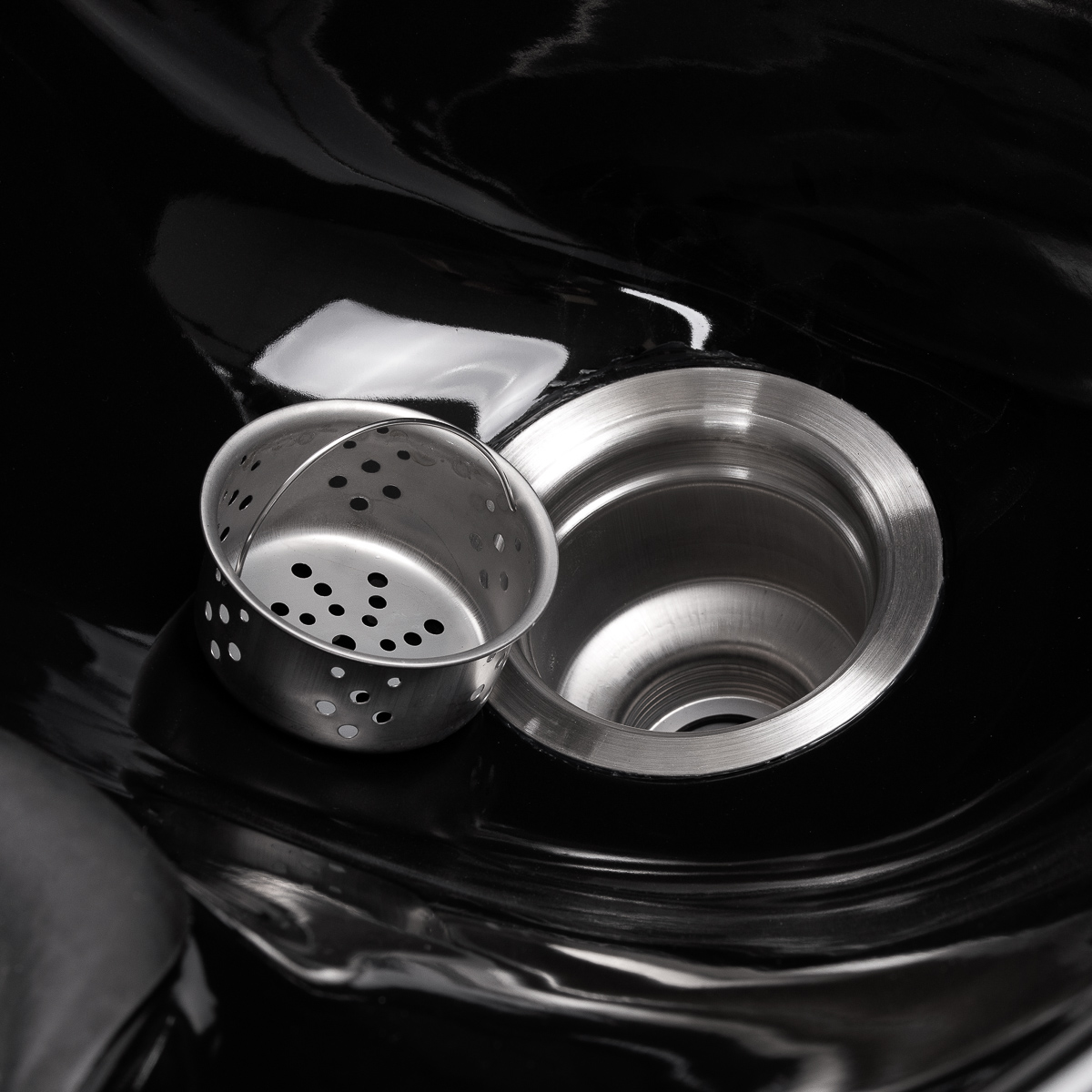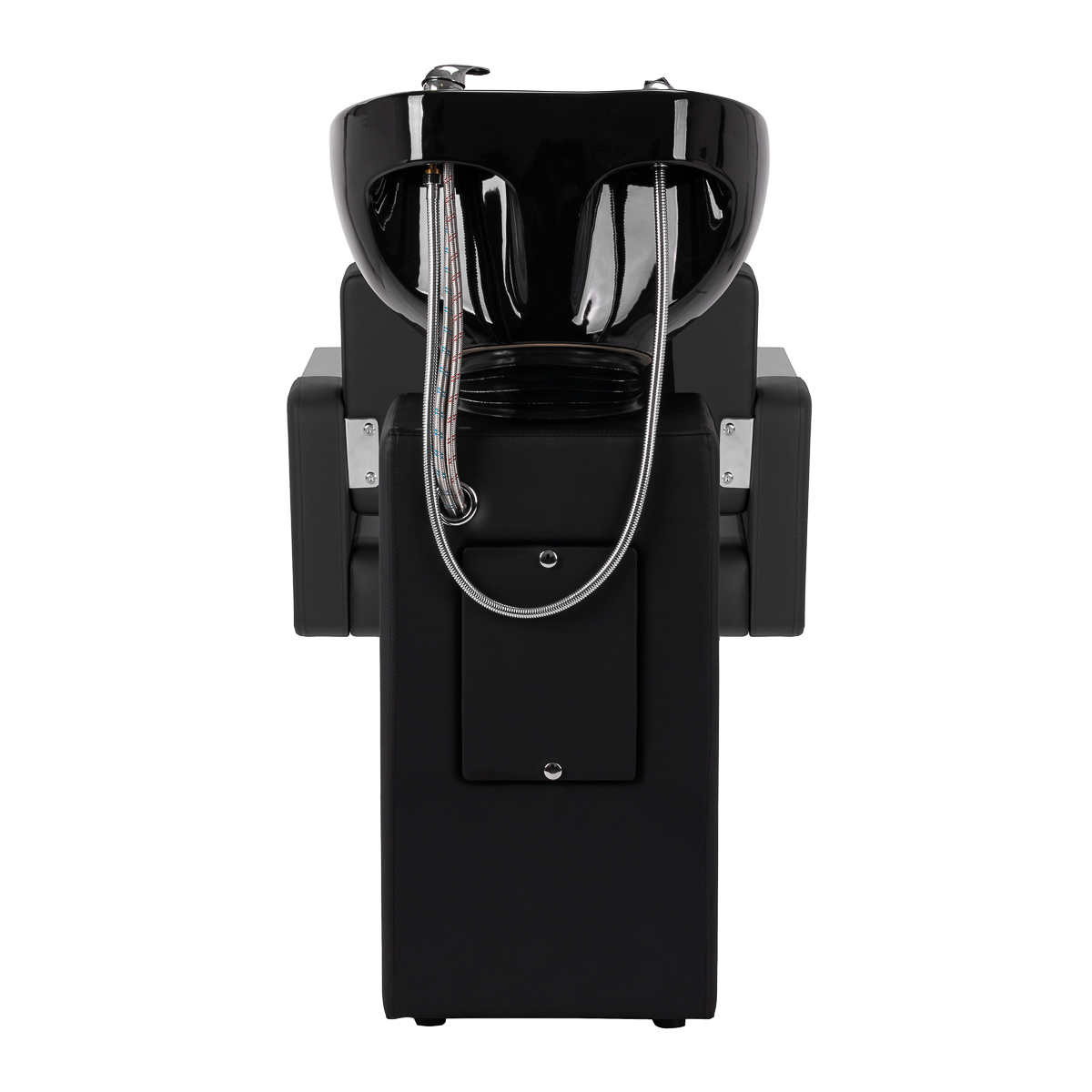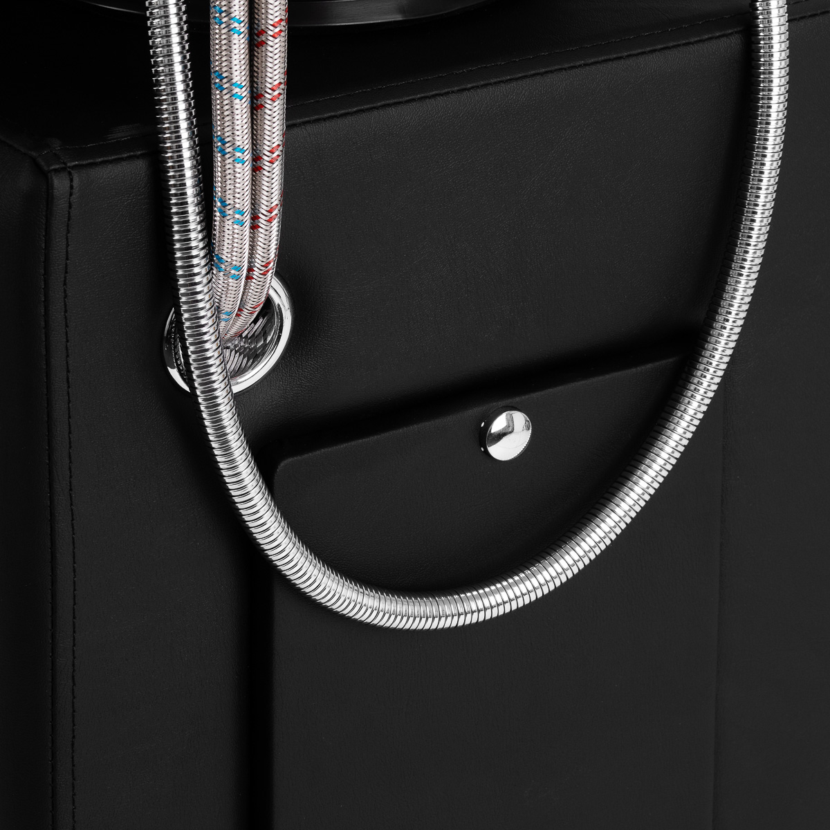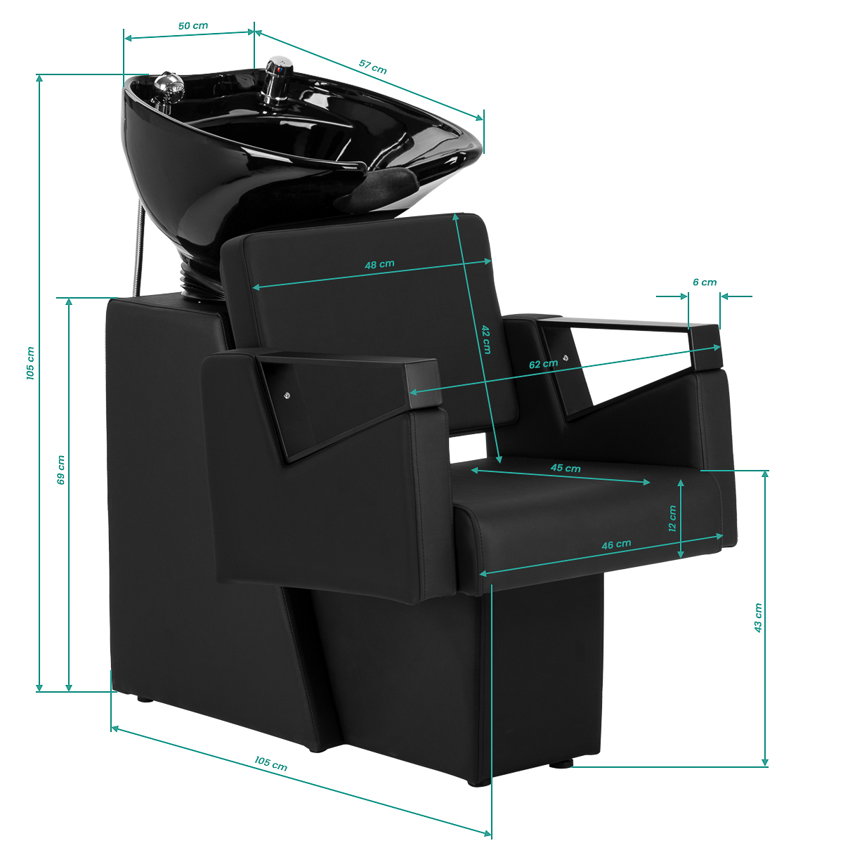 Funkcjonalny mebel o ciekawym designieErgonomicznie wyprofilowany fotel z trwałym wypełnieniem piankowym zapewnia wysoki komfort użytkowania. Stabilne oparcie gwarantuje odpowiednie podparcie pleców i sprzyja utrzymaniu prawidłowej pozycji klienta. Zastosowane materiały wyróżniają się trwałością oraz łatwością utrzymania w czystości. Pokrycie ze skóry syntetycznej w odcieniach czerni oraz ozdobne czarne elementy nadają mu ponadczasowej elegancji. Klasyczne wykończenie sprawia, że myjnia wpisuje się w każdą aranżację wnętrza, podkreślając profesjonalny styl salonu. W zestawie znajduje się kompletna armatura, obejmująca baterię, słuchawkę prysznicową oraz dedykowane węże, zapewniające pełną gotowość stanowiska do pracy.